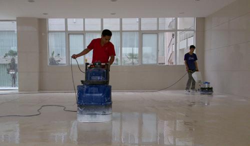 花崗巖翻新,花崗巖雖然質地堅硬致密、強度高、抗風化、耐腐蝕、耐磨損、吸水性低,是建筑的好材料,但是花崗巖石材地板長期使用也會出現磨損、孔洞、橘皮現象,要想花崗巖回歸到原來美麗的色澤,花崗巖必須經過打磨翻新拋光才能恢復原來光澤。 花崗巖翻新程序及施工方法: ① 在工作現場設立告示牌,為防止泥漿污物濺到墻壁,用塑料透明薄膜把地面圍墻壁底部貼好。在花崗巖翻新機水箱里加入清水,接好電源,準備好各型號金屬磨片、翻新片等,并調整設備與地面水平,準備工作。如地面有舊蠟則先起蠟。 ② 使用50#金屬磨片6片,分別旋緊安裝在兩個磨頭盤上,加兩塊共50公斤的配重鐵,將花崗巖翻新機轉速調到500轉/分左右,放水并起動電機研磨。每次研磨1平米左右面積,反復推拉3~5遍,將石材剪口部分研磨至平滑,研磨時水量適中,禁止干磨,用吸水機吸干、吸凈地面。 ③ 更換150#金屬磨片、300#金屬磨片,按順序研磨,整平剪口,消除粗糙磨痕。反復研磨,刮洗吸干地面。 ④ 使用200#、400#、800#, 機器轉速500轉/分鐘繼續進行研磨。 ⑤再使用1500#、3000#拋光片對表面進行拋光,這時將機器上的兩塊配重鐵取下,將轉速從500轉/分鐘提高到650轉/分鐘,最后將石材表面洗凈、吹干,呈現出靚麗的色彩。 有些石材在翻新后出現顏色變淺等色差,是因為石材在出廠前為了減少色差做過特殊的著色處理,而這些特殊著色劑在翻新研磨過程中被研磨掉,還原了石材的本來面目,因此會出現深色石材褪色、變淺,出現色差現象。